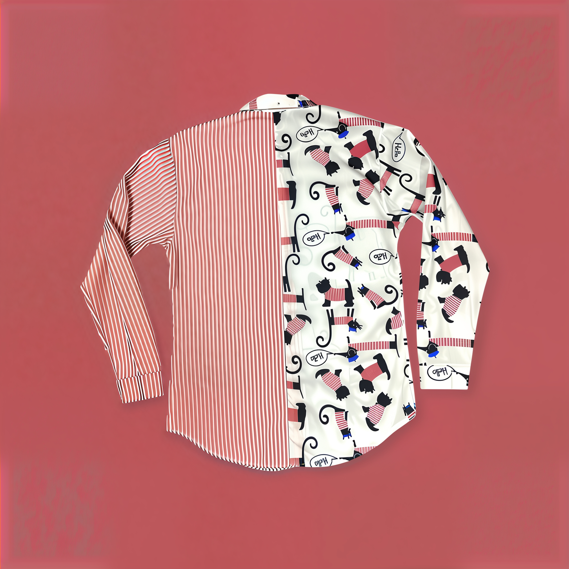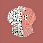 Kadın Kırmızı Çizgili Kedi,Köpek Desenli Belden Oturtmalı Gömlek
